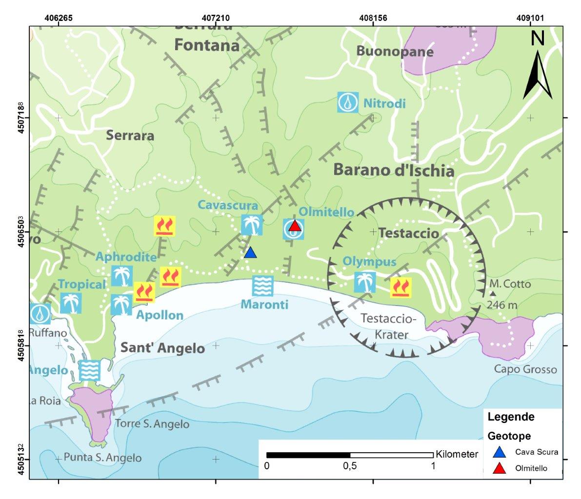 Bei der Cava Scura Schlucht gibt es eine Thermalwasserquelle, das ist ein Austritt von natürlichem Grundwasser an der Erdoberfläche, die eine deutlich höhere Temperatur als seine Umgebung aufweisen. Es handelt sich um eine Quelle an einer Bruchlinie. An dieser kann Regenwasser hinabsickern. Im Erdinneren kommt es mit heißen Gesteinen in Kontakt, wird erwärmt und es werden Mineralstoffe herausgelöst. Das mit Mineralien angereicherte, erwärmte Wasser steigt entlang der Bruchlinie bis zur Erdoberfläche auf und tritt dort aus. Um das Wasser als Thermalwasser bezeichnen zu können, darf es eine Temperatur von 20 °C nicht unterschreiten. Das Thermalwasser, das bei der Cava Scura Schlucht entspringt, weist Temperaturen um 43°C auf und ist vorrangig an Na+, Cl-, HCO3- und SO42--Ionen angereichert. Dieses warme, heilende Wasser nutzten bereits die Römer und errichteten eine Badeanstalt.